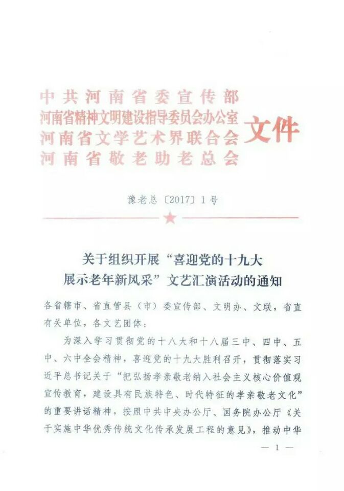關(guān)于組織開展“喜迎黨的十九大 展示老年新風(fēng)采”文藝匯演活動的通知