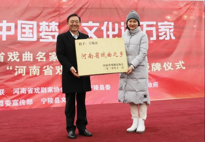 儀式上,陳涌泉宣讀了關(guān)于授予寧陵縣“河南省戲曲之鄉(xiāng)”稱號(hào)的決定,邵麗為寧陵縣授牌。