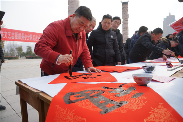 廣場(chǎng)的另一側(cè),文藝志愿者書(shū)法家申慧生、張高山、崔濤、徐要洲、宋高峰、任奎杰、肖毅等被老百姓圍得水泄不通,爭(zhēng)先恐后等待一幅墨寶。書(shū)法家們不畏嚴(yán)寒,熱情飽滿,油墨未干、字跡飄香的春聯(lián)一“出爐”,就被現(xiàn)場(chǎng)熱情的村民搶走了,場(chǎng)面十分火熱,一副副立意新穎、寓涵豐富、主題鮮明的春聯(lián),傳遞著文明和諧的新風(fēng)尚,現(xiàn)場(chǎng)群眾紛紛表示:"手寫(xiě)的春聯(lián),有家的味道、年的氣氛,比在集會(huì)上買(mǎi)的春聯(lián)可好多了”。