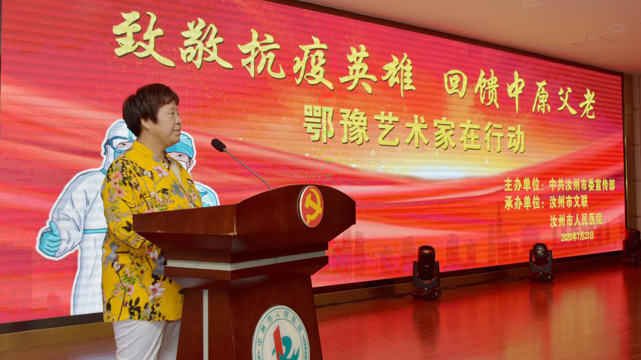 為感謝汝州人民的深情厚誼,7月23日上午,在市人民醫(yī)院六樓會議室舉行“致敬抗疫英雄,回饋中原父老—鄂豫藝術(shù)家在行動”,本次活動由中共汝州市委宣傳部主辦,汝州市文聯(lián)、 汝州市人民醫(yī)院承辦。汝州市文聯(lián)主席相黎麗主持。