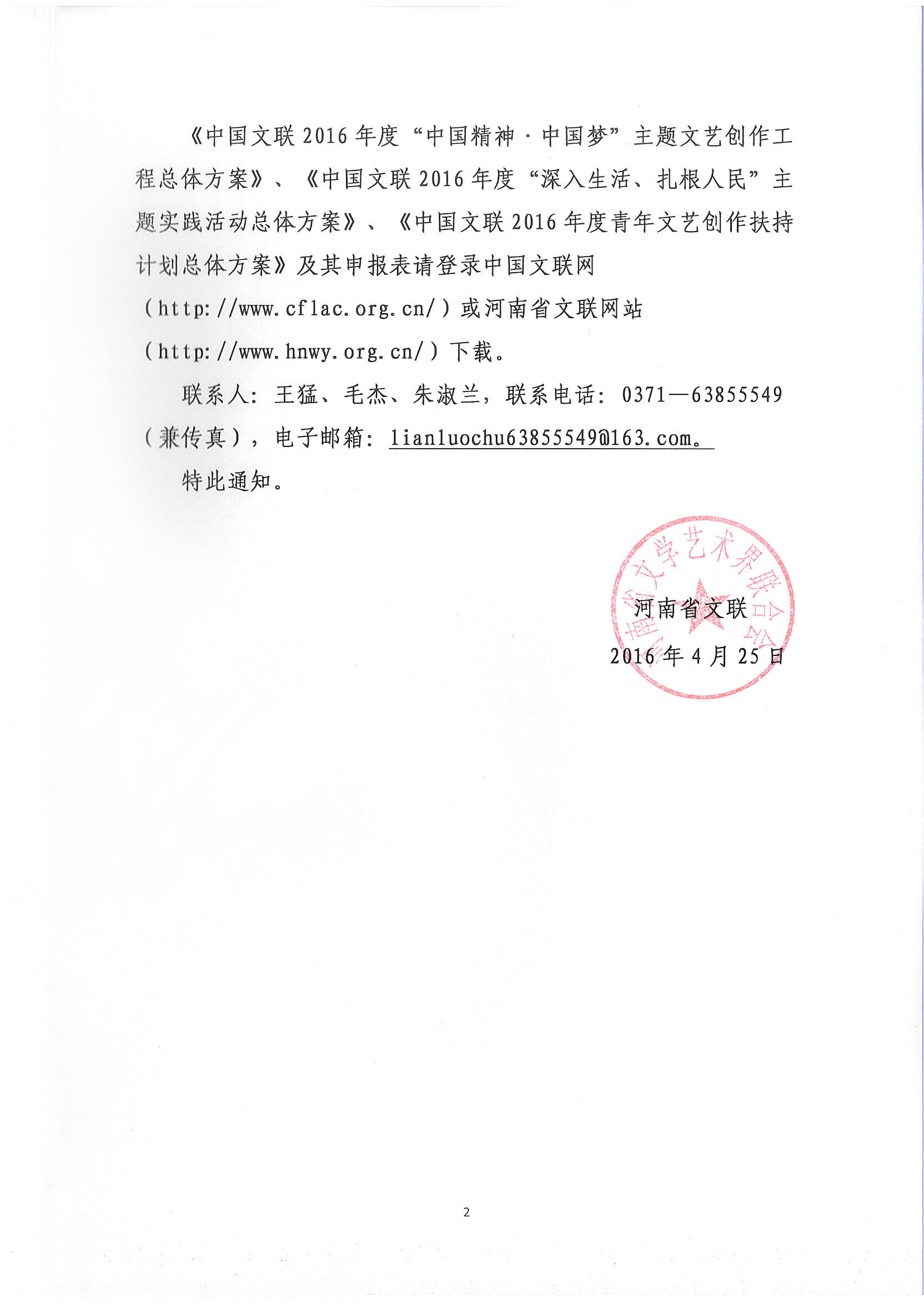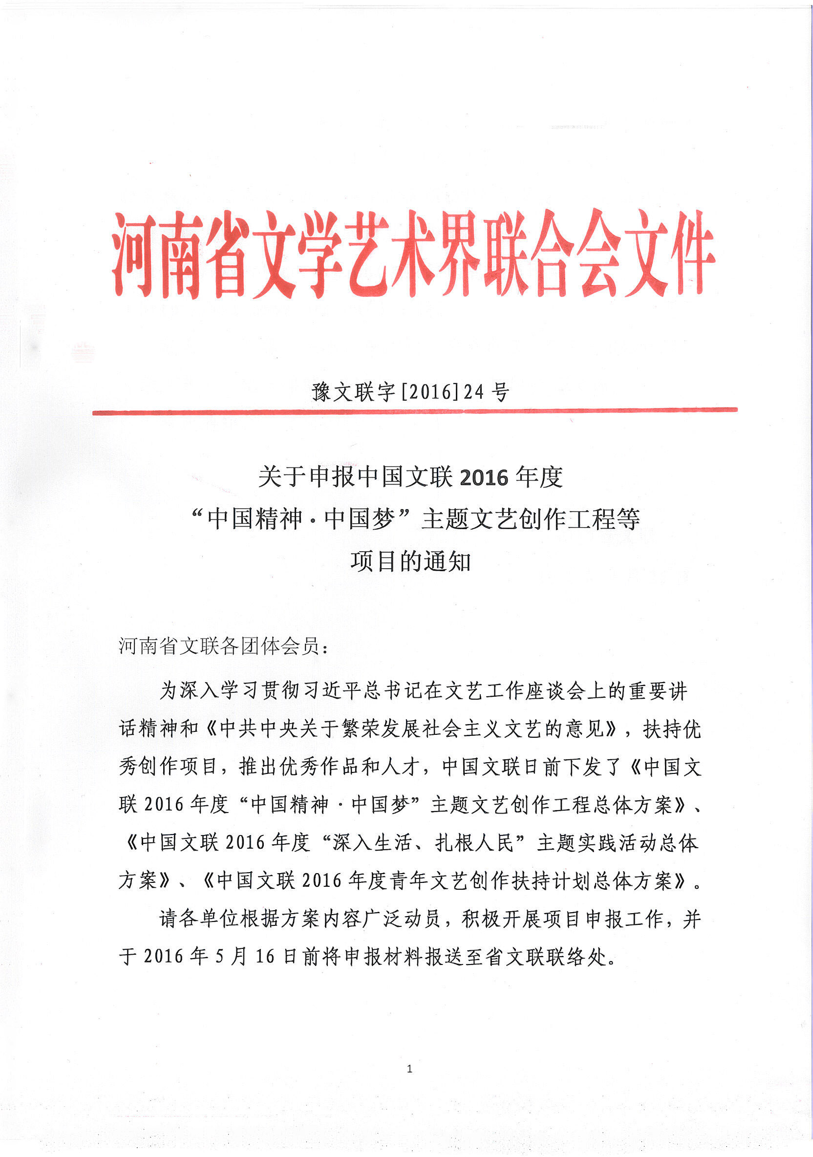 關(guān)于申報中國文聯(lián)2016年度“中國精神·中國夢”主題文藝創(chuàng)作工程等項目的通知 發(fā)布時間:2016-04-28 來源:河南文藝網(wǎng) 人氣:4239 附件(點擊下載): 中國文聯(lián)2016年度“中國精神·中國夢”主題文藝創(chuàng)作工程總體方案 中國文聯(lián)“中國精神·中國夢”主題文藝創(chuàng)作工程項目專項資金申報表 中國文聯(lián)2016年度“深入生活、扎根人民”主題實踐活動總體方案 中國文聯(lián)“深入生活、扎根人民”主題實踐活動項目專項資金申報表 中國文聯(lián)2016年度青年文藝創(chuàng)作扶持計劃方案 中國文聯(lián)2016年度青年文藝創(chuàng)作扶持計劃申報表 上一篇: 關(guān)于切實做好我省2017年文藝創(chuàng)作扶持推薦申報工作的通知 下一篇: 祝賀中國文聯(lián)文藝研修院新媒體學(xué)習(xí)平臺上線暨首批特聘導(dǎo)師受聘儀式在京舉辦