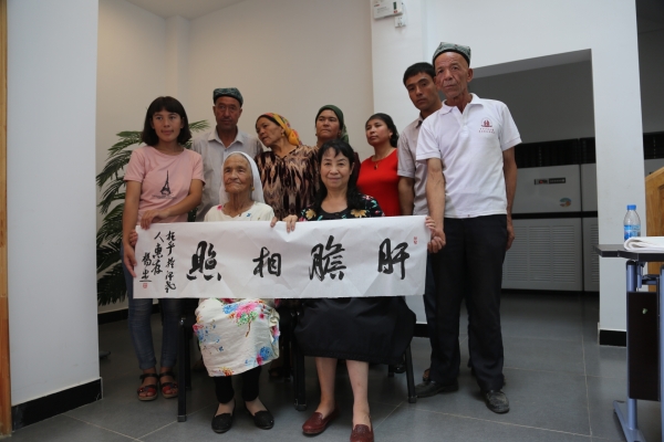 河南省文聯(lián)書(shū)畫(huà)家代表團(tuán)一行參觀了庫(kù)爾班·吐魯木的生平簡(jiǎn)介、歷史照片、有關(guān)文獻(xiàn)和實(shí)物,觀看了庫(kù)爾班大叔的宣教影片。隨后,書(shū)畫(huà)家們揮毫潑墨,把對(duì)庫(kù)爾班大叔事跡的感動(dòng),用書(shū)畫(huà)創(chuàng)作的形式抒發(fā)出來(lái),創(chuàng)作了“聽(tīng)黨話、感黨恩、跟黨走”“肝膽相照”“民族團(tuán)結(jié)一家親,攜手共筑中國(guó)夢(mèng)”等一幅幅歌頌民族團(tuán)結(jié)的書(shū)法作品。庫(kù)爾班·吐魯木88歲的長(zhǎng)女托乎提汗·庫(kù)爾班懷著激動(dòng)的心情用歌聲表達(dá)了自己的感激。