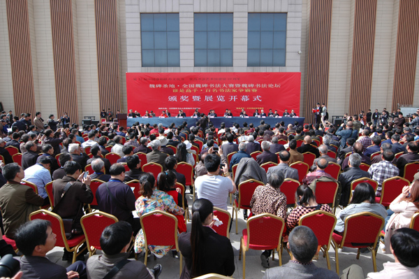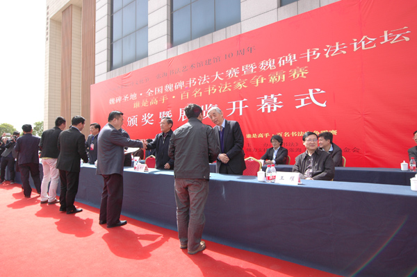 4月16日上午,第33屆中國洛陽牡丹文化節(jié)期間,值張海書法藝術(shù)館建館十周年之際,由河南省文聯(lián)、洛陽市政府主辦的“魏碑圣地·全國魏碑書法大賽暨魏碑書法論壇”開幕式,《書法》雜志社主辦的“誰是高手——百名書法家爭霸賽”頒獎(jiǎng)儀式,在洛陽偃師張海書法藝術(shù)館同時(shí)舉行。全國政協(xié)科教文體委副主任胡振民,全國政協(xié)常委、中國書協(xié)主席張海,中國書協(xié)副主席吳善璋、張改琴,中國書協(xié)副秘書長潘文海,河南省政協(xié)副主席錢國玉,河南省委宣傳部常務(wù)副部長王耀,河南省文聯(lián)主席楊杰,河南省文聯(lián)副主席張劍鋒,洛陽市委常委、宣傳部部長楊炳旭,上海書畫出版社社長王立翔,《書法》雜志社主編胡傳海等出席。