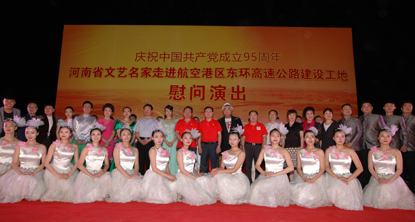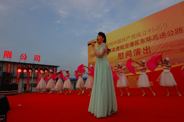 當(dāng)晚,由省委宣傳部、省文化廳、省交通運(yùn)輸廳主辦,河南省收費(fèi)還貸高速公路管理中心、河南省機(jī)西高速公路建設(shè)有限公司、河南歌舞演藝集團(tuán)承辦的“慶祝中國(guó)共產(chǎn)黨成立95周年”河南省文藝名家走進(jìn)航空港區(qū)東環(huán)高速公路建設(shè)工地慰問(wèn)演出舉行,為工人兄弟和當(dāng)?shù)卮迕駧?lái)了一場(chǎng)精彩的演出。