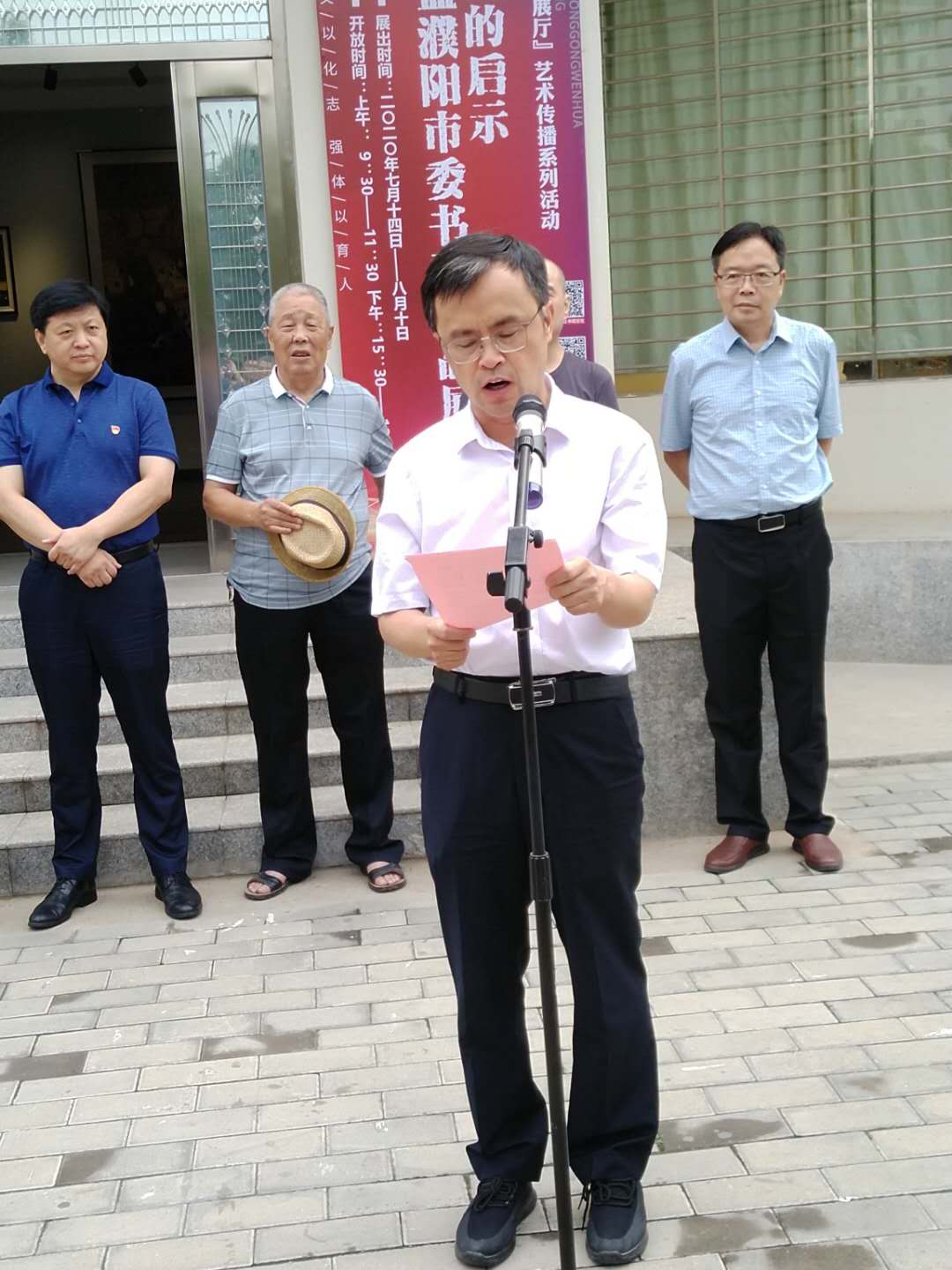 開(kāi)幕式由民盟濮陽(yáng)市委副主委、濮陽(yáng)市文聯(lián)副主席劉小江民盟濮陽(yáng)市委主委張煥軍主持,河南省政協(xié)常委、民盟河南省委副主委柳鋒波,濮陽(yáng)市委常委、統(tǒng)戰(zhàn)部部長(zhǎng)黃旭東分別講話。河南省美協(xié)副主席、民盟中央美術(shù)院副院長(zhǎng)、民盟河南美術(shù)院執(zhí)行院長(zhǎng)李健強(qiáng),濮陽(yáng)市人大副主任鄒東波,民盟濮陽(yáng)市委主委張煥軍、副主委段世榮,中原油田文聯(lián)副主席李保生,中原油田書(shū)協(xié)顧問(wèn)王則敬、楊崇禮,中原油田美協(xié)主席王其中等出席。