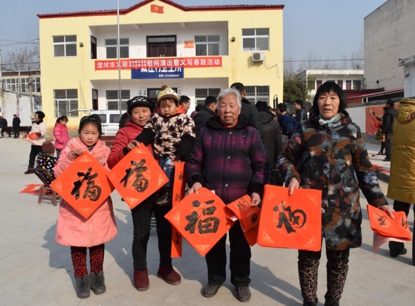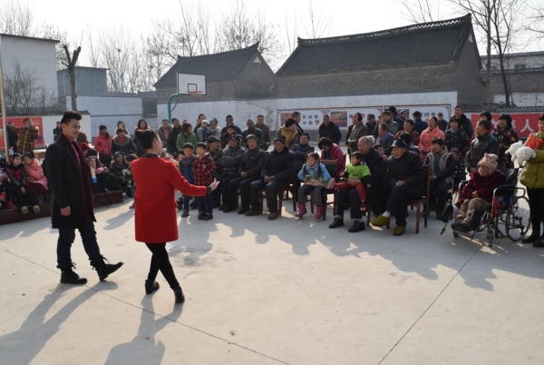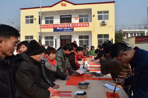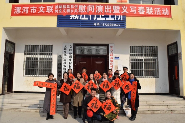 活動(dòng)中,8位知名藝術(shù)家為群眾送去了歌曲、豫劇、相聲、魔術(shù)等形式多樣的文藝表演,為戴莊村的父老鄉(xiāng)親奉獻(xiàn)了一場(chǎng)文明鄉(xiāng)風(fēng)能量滿滿的文化盛宴。演出吸引了村里大批群眾前來(lái)觀看,不時(shí)博得陣陣掌聲,場(chǎng)面十分熱鬧。義寫春聯(lián)的活動(dòng)現(xiàn)場(chǎng),6位書法家揮毫潑墨,行、隸、草書各顯神韻,為群眾現(xiàn)場(chǎng)書寫了以社會(huì)主義核心價(jià)值觀為主題的春聯(lián)200多副,福字200多幅,營(yíng)造了濃厚的節(jié)日氛圍。