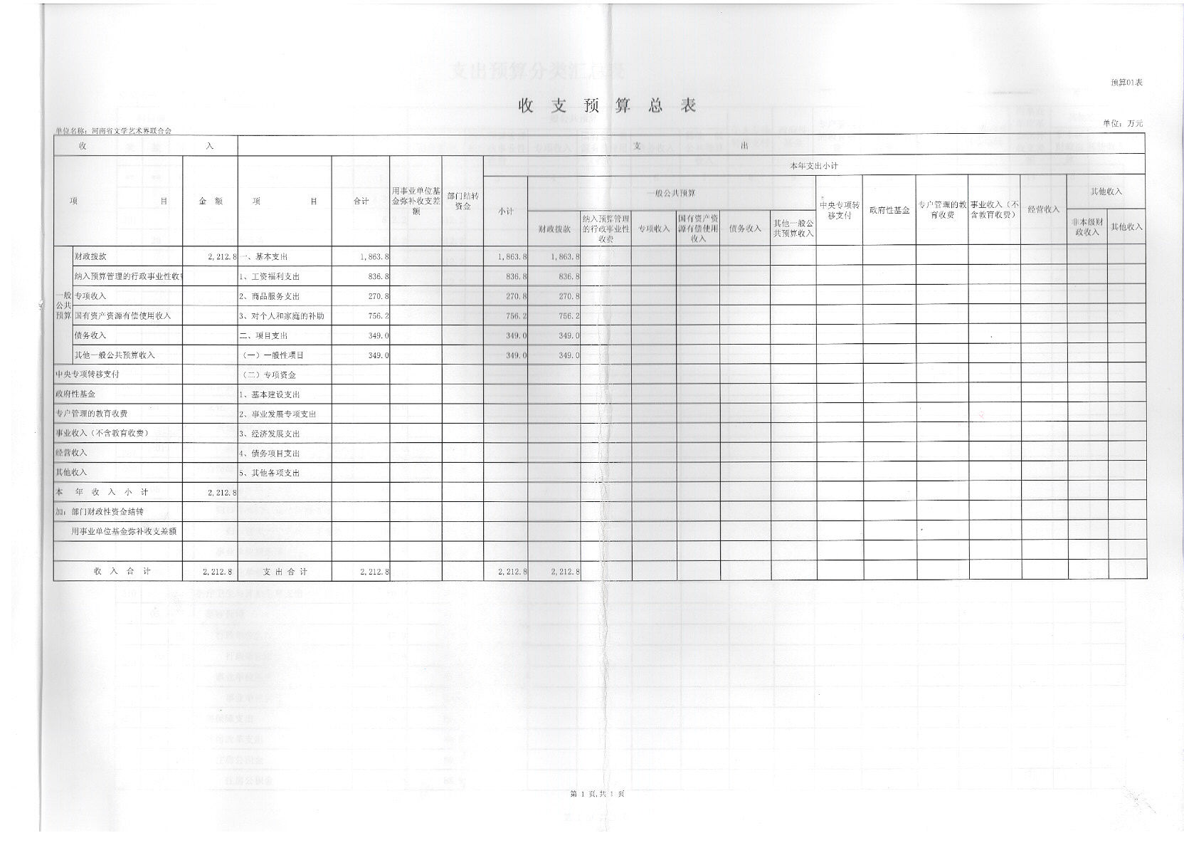 2015年河南省文聯(lián)收支預(yù)算總表 發(fā)布時(shí)間:2016-05-13 來(lái)源:河南文藝網(wǎng) 人氣:3639 上一篇: 2017年度河南省文學(xué)藝術(shù)界聯(lián)合會(huì)部門預(yù)算公開 下一篇: 河南省文學(xué)藝術(shù)界聯(lián)合會(huì)2013年度收入支出決算總表