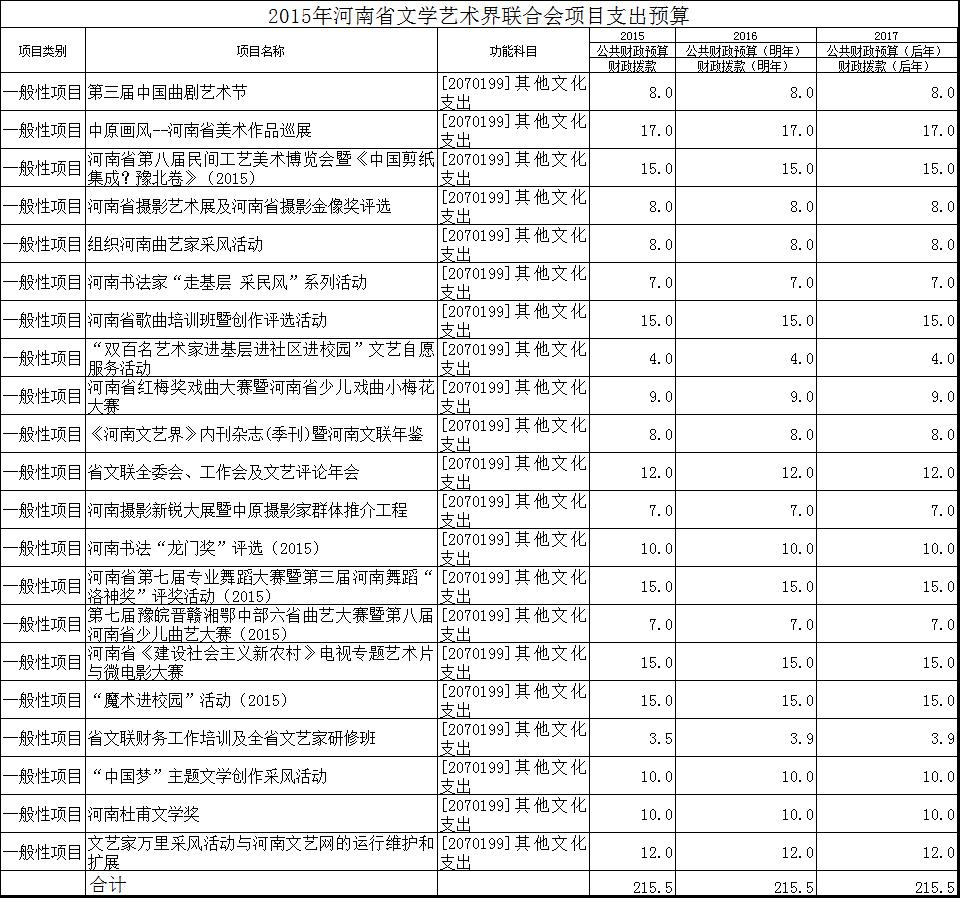 2015年河南省文學(xué)藝術(shù)界聯(lián)合會(huì)項(xiàng)目支出預(yù)算 發(fā)布時(shí)間:2015-03-09 來源:河南文藝網(wǎng) 人氣:3691 上一篇: 2015年河南省文聯(lián)部門預(yù)算公開情況說明 下一篇: 河南省文學(xué)藝術(shù)界聯(lián)合會(huì)2013年度收入支出決算總表